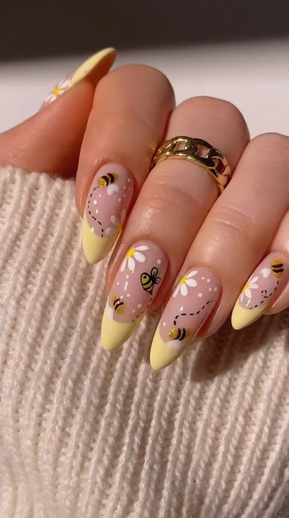 1. Butter Yellow French Tips with Bees