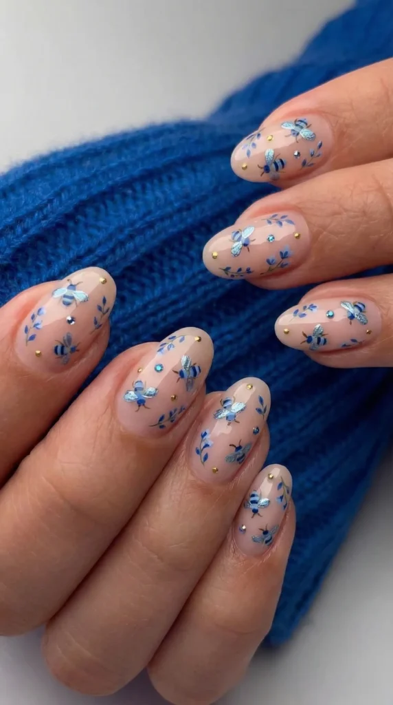 A totally unexpected twist on the trend: sheer nude almond nails are adorned with metallic blue bees, tiny blue botanical leaves, and gold rhinestone dots for a sophisticated, editorial-ready look.