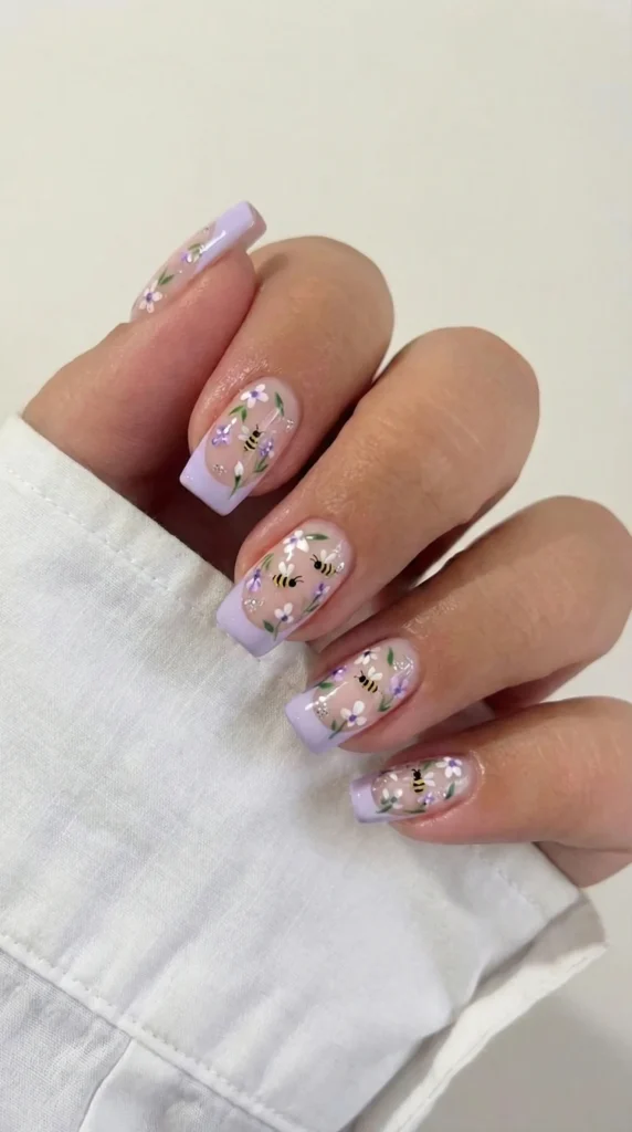 9. Lilac French Square Tips with Bees & Wild Florals