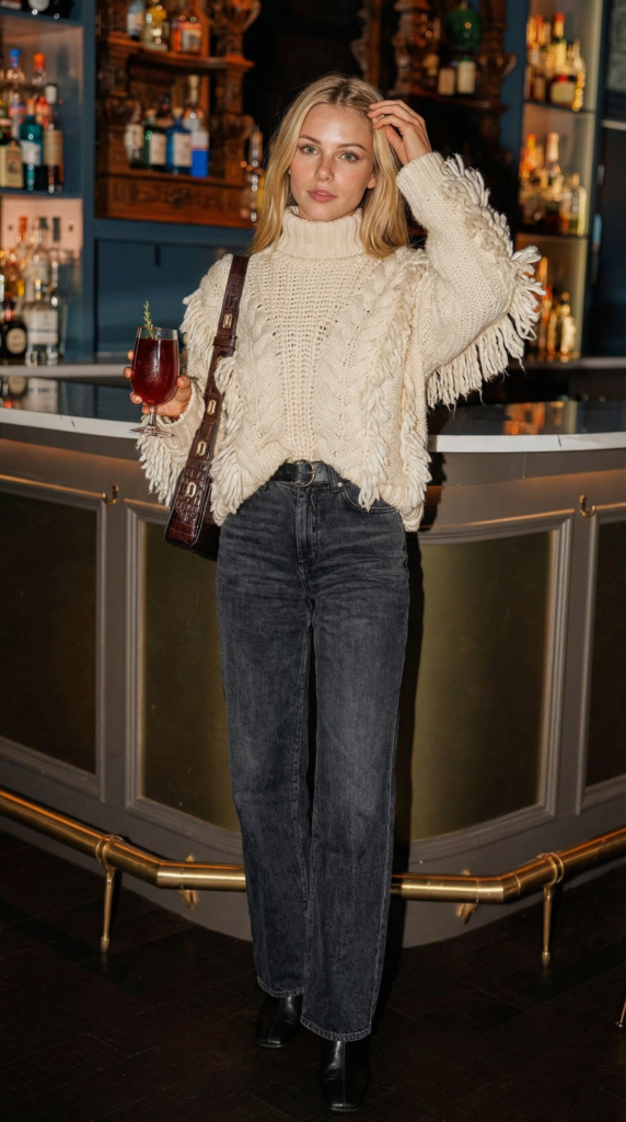 Fringe does the talking so the rest of the outfit doesn’t have to. Tights are the unsung hero here — warm, flattering, and still cute.