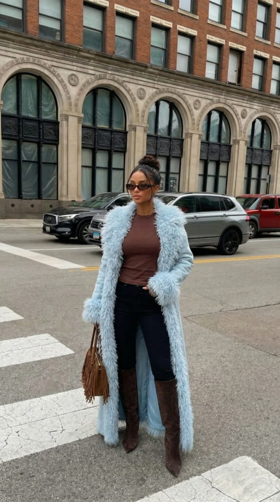 Mixing cozy and glam makes this outfit feel fun and unexpected.